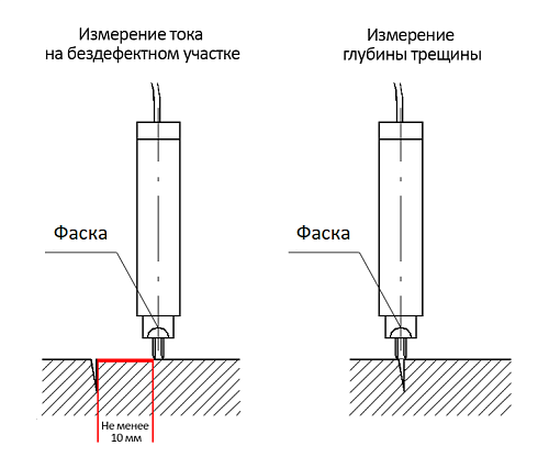 Данный датчик имеет 4 электрода, которые располагаются в 2 ряда. Предназначен для измерения глубины трещин от 0,5 до 20 мм.
